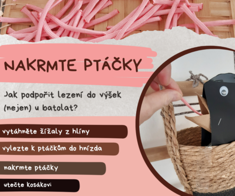 Jak motivovat děti, aby lezly do výšky? Atraktivní téma a aktivity jim pomůžou překonat strach lezení do výšek. Tato lekce, kterou jsem využila pro děti necelé 2 roky – cca 4,5 byla velmi atraktivní a děti nadšeně běhaly a lovily žížaly, kterými postupně krmily ptáčky v hnízdečku. Zaměření lekce: koordinace celého těla, posílení středu, prostorová orientace Pomůcky: ptáčci, košíčky na zavěšení, nastříhané provázky...