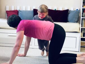 Vždycky jsem obdivně koukala na videa, kde maminky, někdy tatínci cvičí s dětmi různá zpevňovací cvičení a děti u nich opravdu vydrží. Je mi jasné, že je to věc disciplíny, ale moje děti se mnou doma nikdy cvičit nechtěly. Chvilku vydržely, když jsem cvičila já sama, ale pak stejně odběhly. Na svých lekcí zažívám občas to samé. Vymyslím, zpevňovací část lekce a děti vydrží tak 2 cviky a pak odběhnou 🙂 prostě jim chybí akce. Co je ale vždycky baví, je cvičení s rodičem, po kterém různě šplhají, tlačí ho a nechávají se zvedat a různě točit. Stejně tak to měly moje dcery doma. „Blbnout“ se mnou vydržely hodně dlouho. Maminky mi na lekcích mezi řečí vlastně potvrzovaly to samé. Začala jsem tedy pátrat, co můžu všechno s dětmi zkoušet. Se svými dětmi jsem se toho vůbec nebála od malička a tak jsem do toho šla.