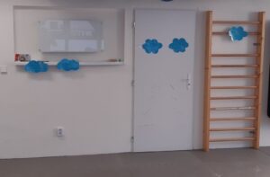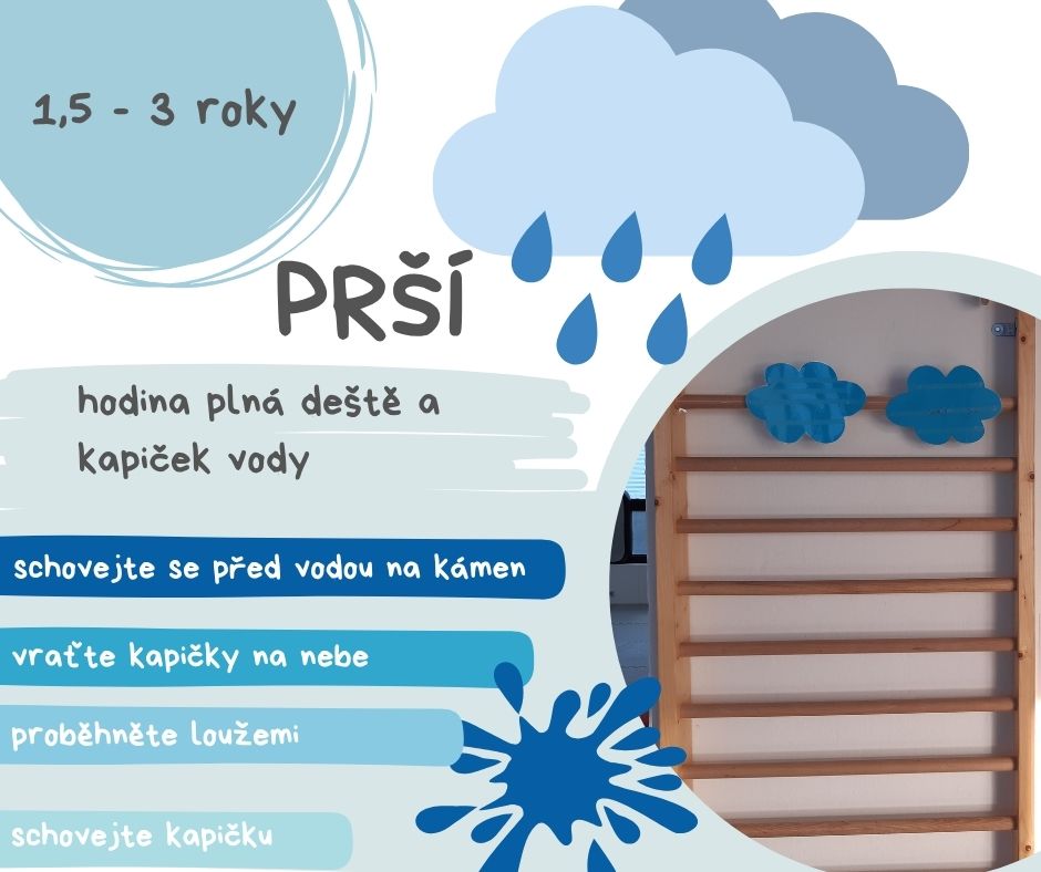 Skákejte do kaluží (obruče) a to, co se rozstříklo – kapičky – vraťte potom zpátky na mráčky ( dejte mráčky dětem vysoko, nechte je šplhat a tam, kde je to vysoko, vytvořte jim „schody“ například ze švédské bedny nebo balančních kamenů