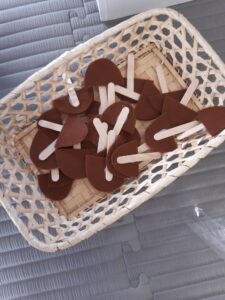 Hledali jsme pod listím schované hříbečky a listy odnášely z lesa pryč, aby nám zbytečně netlely – odnášeli jsme je na lopatě ( vytvořené pálky jako na „pingpong“ z kartonu, širokého na nanukového dřívka a lepící pásky.