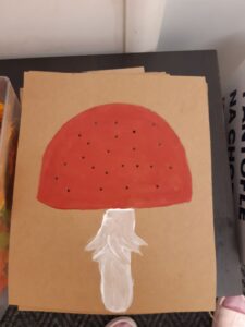 Odpočinuli jsme si zase u muchomůrek – vraceli jsme jim bradavičky – jemná motorika – nakreslená kartička s houbou, špejlí vytvořené díry a naštípané uchošťoury.