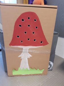 Odpočinuli jsme si zase u muchomůrek – vraceli jsme jim bradavičky – jemná motorika – nakreslená kartička s houbou, špejlí vytvořené díry a naštípané uchošťoury.