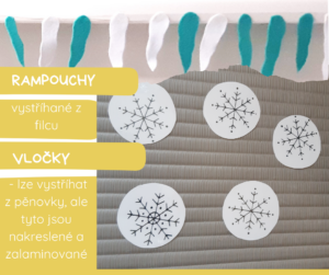 Najdeme vločky, popadané po zemi – děti hledají po místnosti a nosí do „ledového kyblíku“